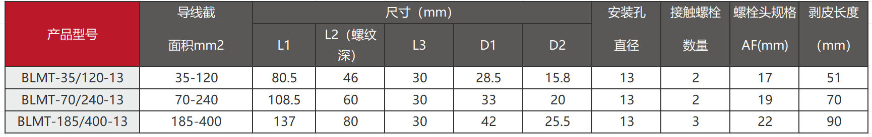 | BLMT-185/400-13 | 185-400 | 137 | 80 | 42 | 25.5 | 13 | 3 | 22 | 90 |